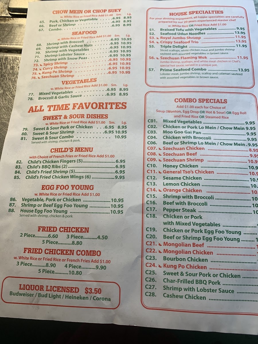 The offerings range from beloved poultry options like Orange Chicken and General Tso's Chicken to heartier house specialties such as the Szechuan Flaming Wok or Triple Delight. You can enjoy these dishes alongside staples like steamed white rice, fried rice, or even French fries, providing familiar accompaniments that fit well with the unpretentious atmosphere.